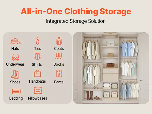 Przestrzenne przechowywanie: Drewniana półka w szafie posiada wiele przegródek do wieszania, eksponowania lub układania ubrań w stosy. Ułatwia to uporządkowanie ubrań i pościeli trzyosobowej rodziny lub jednej osoby.