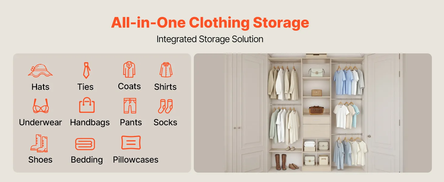 Duża pojemność: Ten system szaf z szufladami wytrzymuje obciążenie do około 362,7 kg i oferuje miejsce na około 100 ubrań. Przegródki pozwalają na uporządkowane oddzielenie ubrań, zapewniając jednocześnie łatwy dostęp i widoczność.