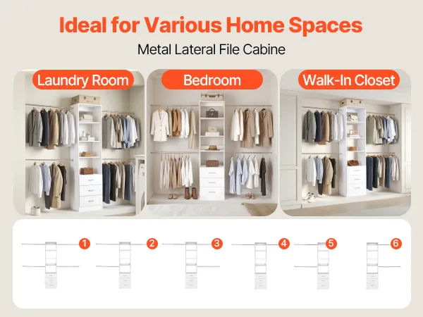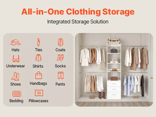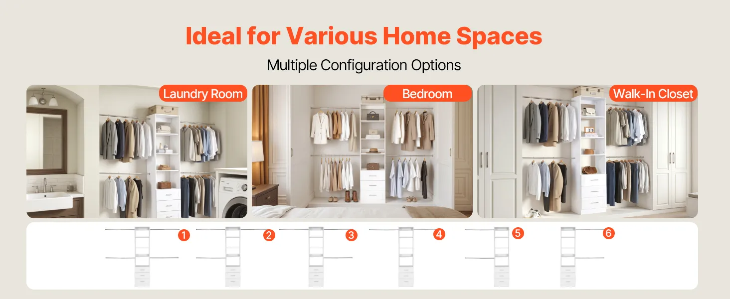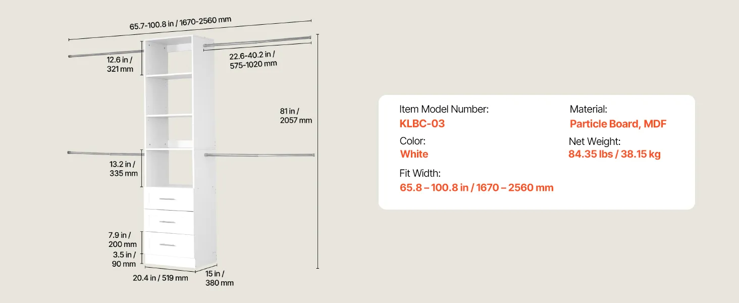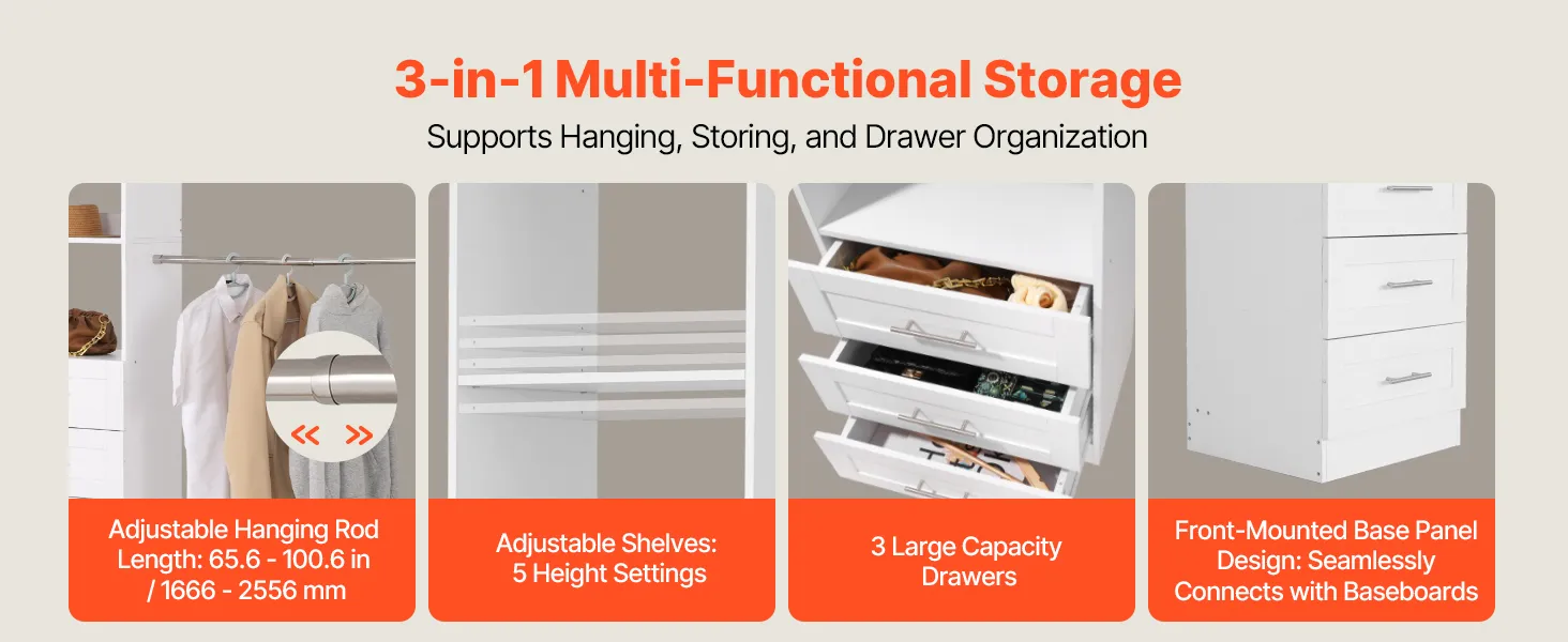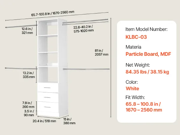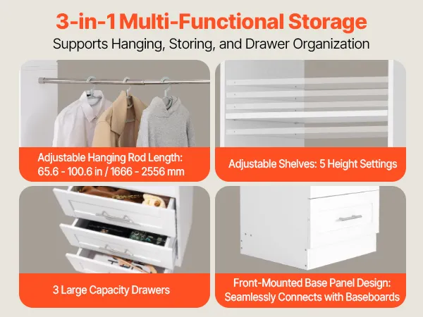 Regulowana konstrukcja: drążek na ubrania można regulować w zakresie od 22,6 do 40,2 cala (575–1020 mm), a półki oferują pięć poziomów wysokości co 1,3 cala (32 mm). Trzy szuflady zapewniają wszechstronne miejsce do przechowywania.