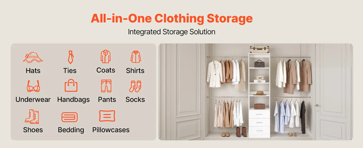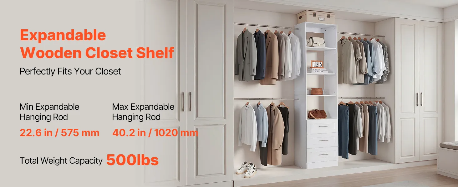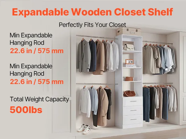 Wieszak na ubrania VEVOR z 3 szufladami, regulowany, drewniany, organizer do garderoby z 4 wysuwanymi drążkami na ubrania (575-1020 mm), system do garderoby typu walk-in