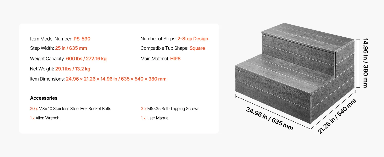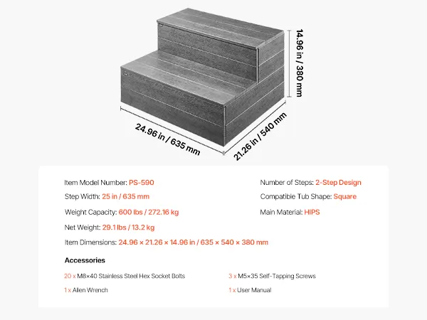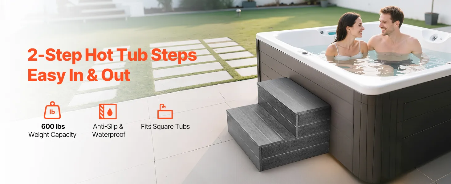 Schody VEVOR do wanny, basenu, 2-stopniowe, zewnętrzne, szerokość 635 mm, drabina HIPS do basenów naziemnych/nadmuchiwanych, nośność 272,16 kg, uniwersalne, do werand, tarasów i kamperów