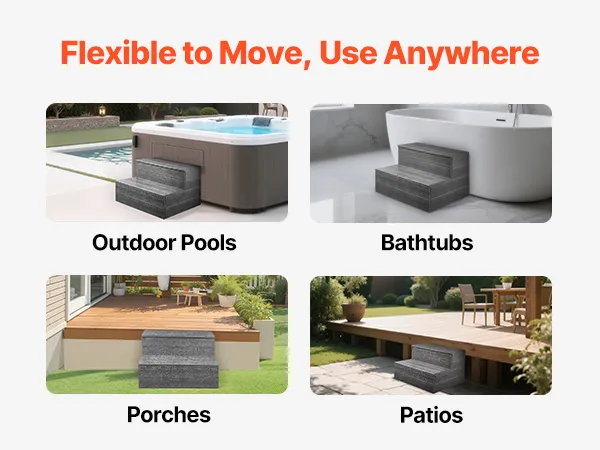 Wszechstronne zastosowanie: Idealne do spa, wanien, basenów naziemnych i dmuchanych, to rozwiązanie idealnie spełnia różnorodne potrzeby w zakresie dostępu. Wyposaż swoją przestrzeń w niezawodny stopień już dziś.