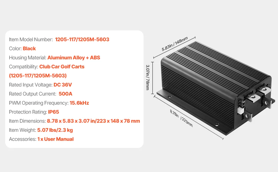 Nasz sterownik wózka golfowego pasuje do modeli Club Car 1205-117/1205M-5603 i jest łatwy w obsłudze. Dzięki wejściu 36 V i wyjściu 500 A, wodoodporności IP65 oraz obudowie ze stopu aluminium i tworzywa ABS, jazda będzie bezstresowa. Szybki start i pasmo przenoszenia wysokiej częstotliwości 15,6 kHz zwiększają wydajność i osiągi.