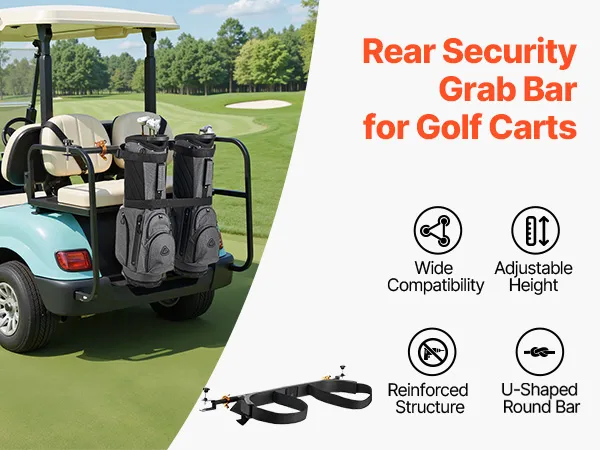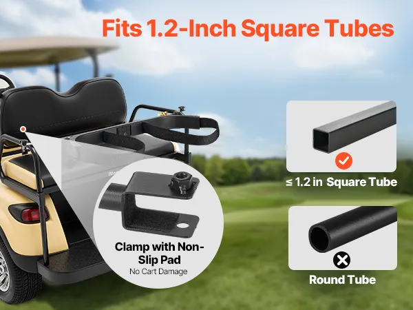 Uchwyt na torbę golfową VEVOR (1370 x 195 x 60,5 mm) kompatybilny z większością tylnych siedzeń 2+2 z rurami kwadratowymi o przekroju 30,48 mm, regulowany uchwyt na kije do wózka na tylne siedzenie z paskiem, nie wymaga wiercenia