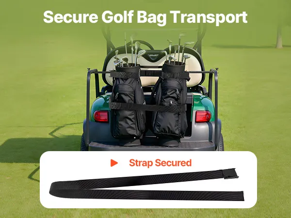 Paski zamykające torbę: Uchwyt na torbę do wózka golfowego wyposażony jest w paski zamykające, które bezpiecznie zabezpieczają torbę i zapobiegają jej chwianiu się lub upadkowi nawet na nierównym terenie