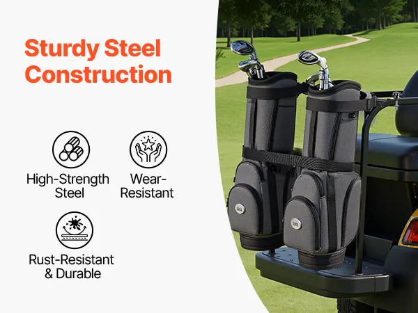 Wytrzymała stal: Nasz uchwyt na torbę golfową jest wykonany z wytrzymałej stali z czarną powłoką. Odporny na warunki atmosferyczne, nadaje się do długotrwałego użytkowania na polach golfowych.