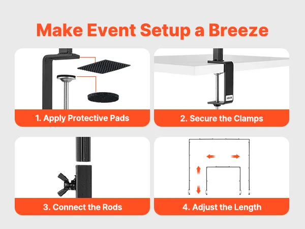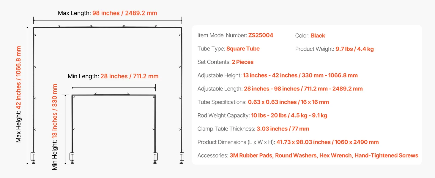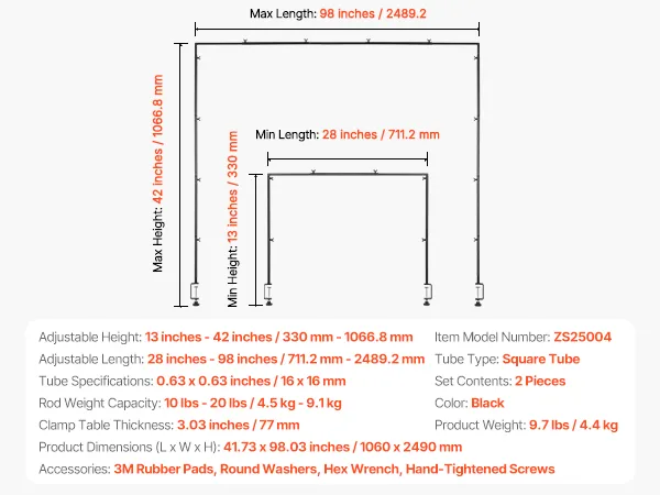 Solidna, nośna konstrukcja: Ten stojak na stół wykonany jest z kwadratowych rur i zacisków C o średnicy 77 mm, oferując nośność od 4,5 kg do 9,1 kg. Dzięki temu jest trwalszy i stabilniejszy niż konwencjonalne cienkie okrągłe rurki. Odporne na rdzę, malowane proszkowo wykończenie wytrzymuje działanie czynników atmosferycznych.