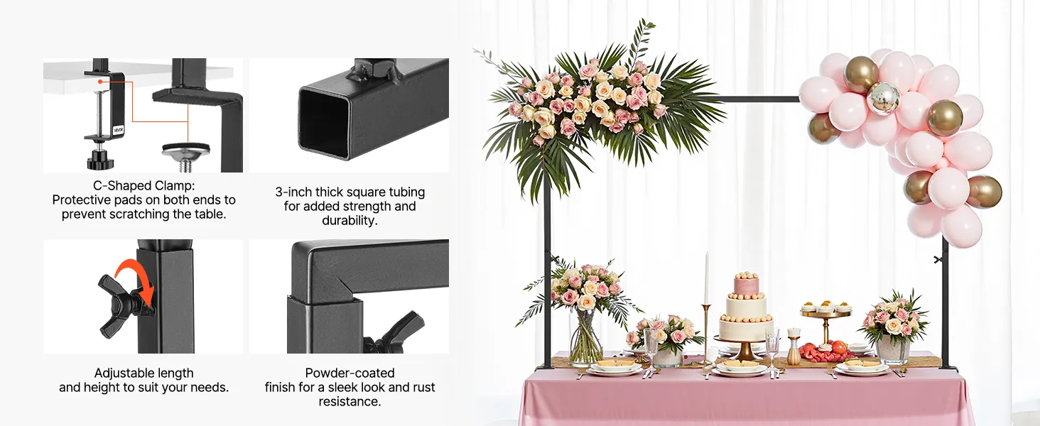 Ten solidny stojak stołowy podtrzymuje dekoracje o wadze do 4,5 kg - 9,1 kg bez przewracania się. Dzięki trzem regulacjom wysokości pasuje do różnych rozmiarów stołów i idealnie nadaje się na wesela, urodziny i inne wydarzenia. Kompletne akcesoria i torba do przechowywania zapewniają łatwe przechowywanie, transport i ochronę.