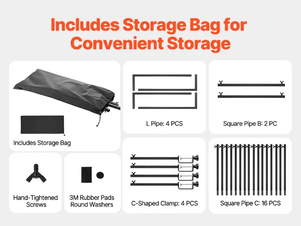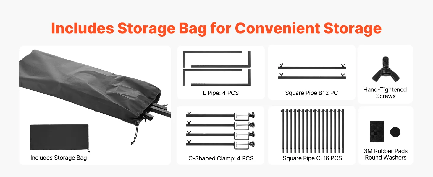 Torba do przechowywania ułatwiająca transport: Rama drążka stołu składa się z kwadratowych rur (4 rury L, 2 rury kwadratowe, 16 rur C, 4 rury C), gumowych podkładek 3M, okrągłych podkładek, klucza imbusowego, śrub dokręcanych ręcznie oraz torby do przechowywania, która ułatwia przechowywanie i transport. Chroń swój stojak przed zarysowaniami i spraw, aby wyglądał jak nowy do przyszłego użytku.
