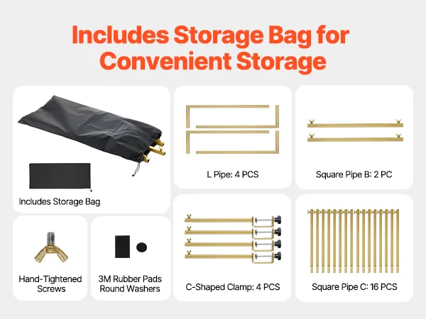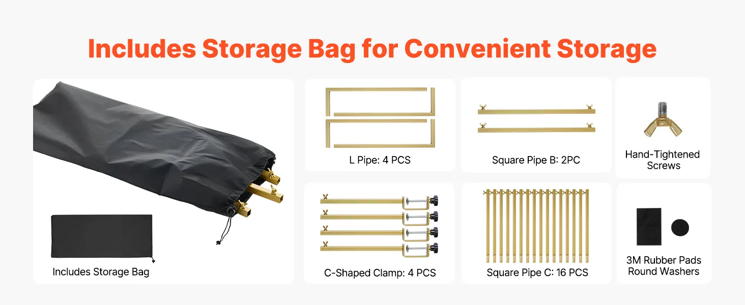 Torba do przechowywania ułatwiająca transport: Rama masztu stołu składa się z kwadratowych rur (4 rury L, 2 rury kwadratowe, 16 rur C, 4 rury C), gumowych podkładek 3M, okrągłych podkładek, klucza imbusowego, śrub dokręcanych ręcznie oraz torby do przechowywania, która ułatwia przechowywanie i transport. Chroń swój stojak przed zarysowaniami i spraw, aby wyglądał jak nowy do przyszłego użytku.