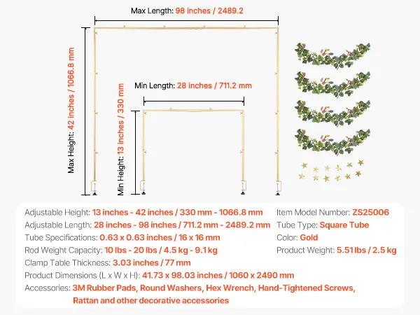 VEVOR Dekoracja stołu Drążek stołowy, wysokość 330-1066,8 mm i długość 711,2-2489,2 mm, regulowany, łuk stołowy z zaciskami, w tym rattan, rama stołu do dekoracji weselnych, urodzinowych i świątecznych, złoty