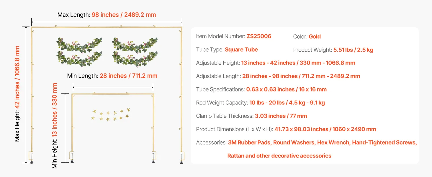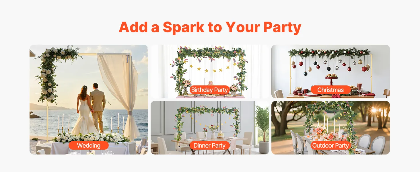 Zawieś światła, podeprzyj balony lub rozłóż baldachim, aby szybko go rozstawić. Idealny na wesela, imprezy i święta. Niezależnie od tego, czy w pomieszczeniu, czy na zewnątrz, ten słup tworzy oszałamiającą atmosferę na każdym wydarzeniu.