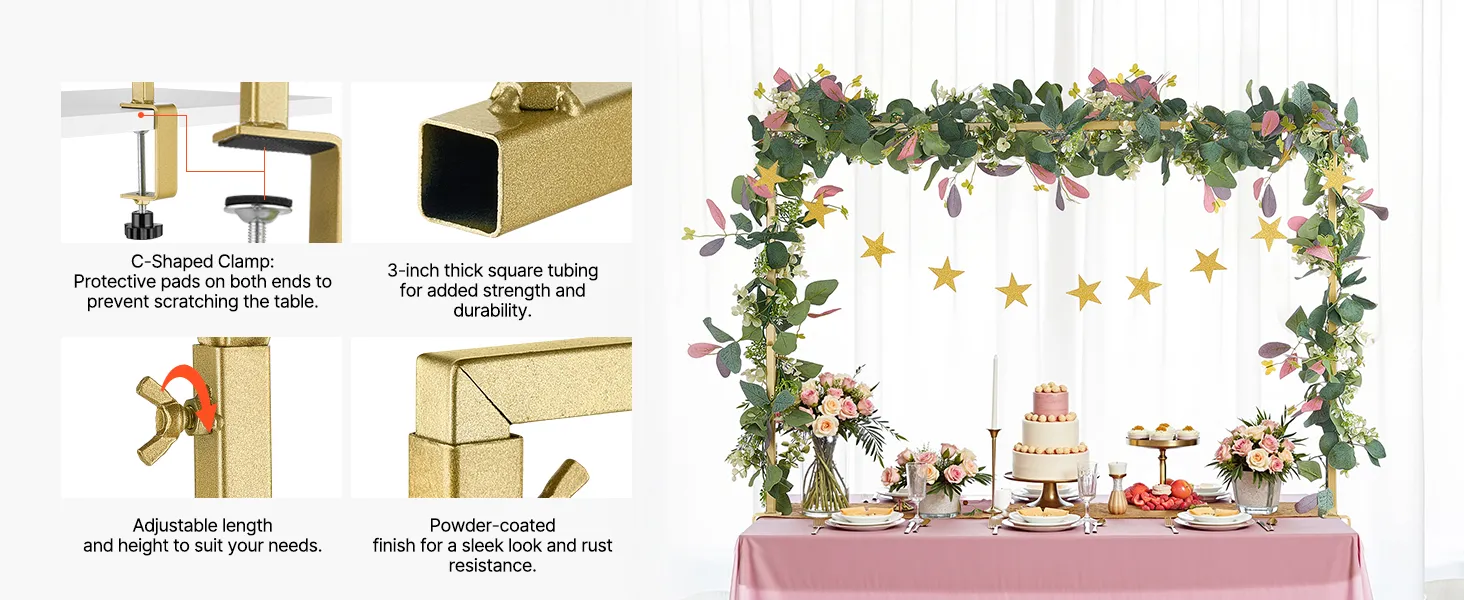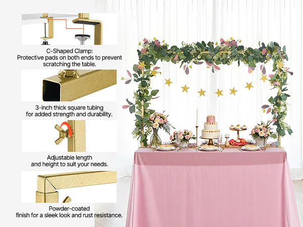 Wszechstronny i elastyczny: przenośny i łatwy do przenoszenia, ten łukowy stojak stołowy jest idealny do użytku wewnątrz i na zewnątrz. Idealny na wesela, uroczystości, przyjęcia urodzinowe, Sylwestra, Halloween, Święto Dziękczynienia, Boże Narodzenie, bufety ze słodyczami i przyjęcia z okazji ukończenia szkoły, spełnia wszystkie Twoje potrzeby dekoracyjne.