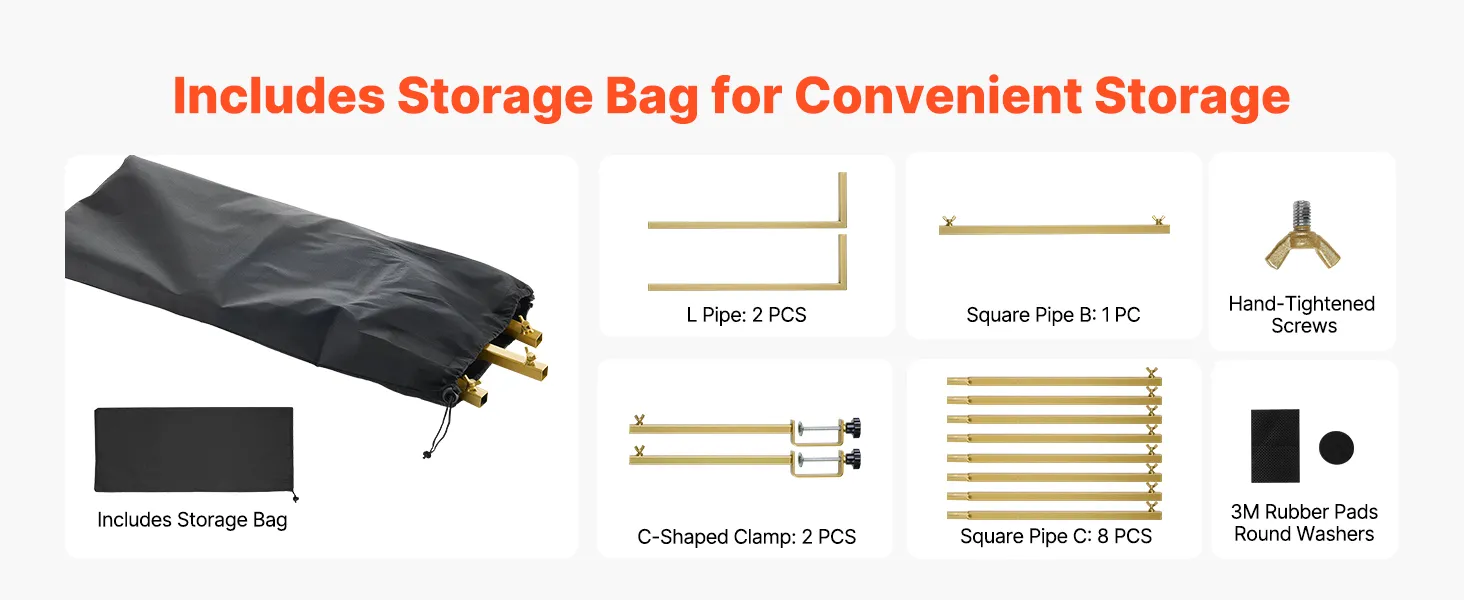 Torba do przechowywania ułatwiająca transport: Rama masztu stołu zawiera kwadratowe rury (2 rury L, 1 kwadratową rurę, 8 rur C, 2 rury C), gumowe podkładki 3M, okrągłe podkładki, klucz imbusowy, ręcznie dokręcane śruby, dekoracyjny rattan, akcesoria w postaci łańcucha gwiazdkowego oraz torbę do przechowywania, która ułatwia przechowywanie i transport. Chroń swój stojak przed zarysowaniami i spraw, aby wyglądał jak nowy do przyszłego użytku.