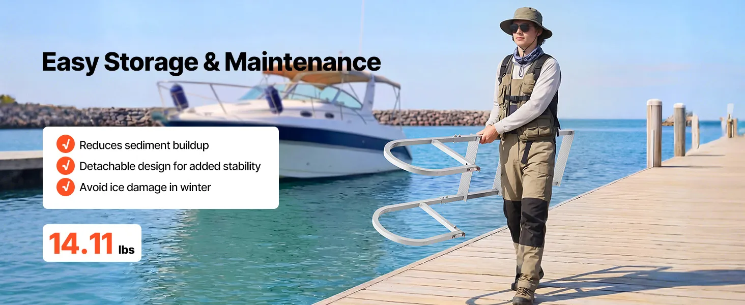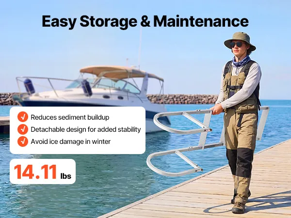 Drabina dokowa VEVOR jest lekka i łatwa w obsłudze. Dzięki temu idealnie nadaje się dla seniorów i dzieci. Waży zaledwie 14,1 funta. Łatwo ją podnosić i przenosić. Pomimo lekkiej konstrukcji drabina jest mocna i niezawodna. Antypoślizgowe gumowe maty na każdym stopniu zapewniają dodatkowe bezpieczeństwo, szczególnie młodszym i starszym użytkownikom. Intuicyjna konstrukcja drabiny oznacza, że instalacja i użytkowanie są proste, nawet dla osób o ograniczonych umiejętnościach technicznych. Dzięki temu jest to doskonały wybór dla rodzin poszukujących niezawodnej i bezpiecznej drabiny dokującej.