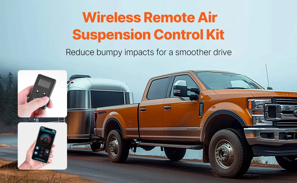 Łatwa kontrola: Zestaw do sterowania amortyzatorami pneumatycznymi umożliwia łatwą regulację zawieszenia pneumatycznego za pomocą aplikacji mobilnej lub pilota, zarówno wewnątrz, jak i na zewnątrz pojazdu. Łatwa kontrola ciśnienia powietrza zapewnia płynną jazdę i automatyczną regulację ciśnienia, która zapewnia stabilność ustawień amortyzatorów pneumatycznych.