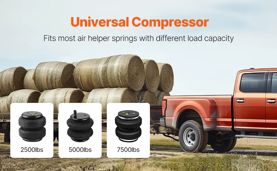 Bezproblemowe pompowanie: Ten zestaw kompresora zawieszenia pneumatycznego zawiera pompkę i kompresor powietrza o ciśnieniu do 100 PSI, co czyni go idealnym do systemów zawieszenia pneumatycznego o masie od 1133,98 do 3401,94 kg (2500 do 7500 funtów). Jest kompatybilny z szeroką gamą pojazdów i marek, umożliwiając szybkie pompowanie miechów pneumatycznych i zapewniając komfortową jazdę.