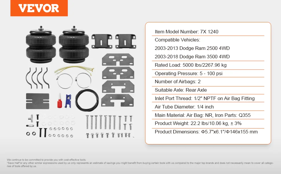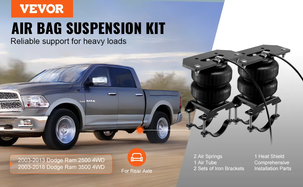 Zestaw zawieszenia pneumatycznego VEVOR jest idealnie dopasowany do konkretnych modeli Dodge Ram. Jest kompatybilny z modelami Dodge RAM 2500 4WD z lat 2003-2013 i Dodge 3500-4WD z lat 2003-2018. Ta kompatybilność zapewnia ścisłe dopasowanie i optymalną wydajność. Zestaw bezproblemowo integruje się z tymi pojazdami, poprawiając w ten sposób ich ładowność i jakość jazdy. Jest to niezawodna modernizacja dla kierowców, którzy chcą ulepszyć układ zawieszenia Dodge Ram. Ciesz się bezproblemowym dopasowaniem i lepszą wydajnością dzięki temu dostosowanemu rozwiązaniu.