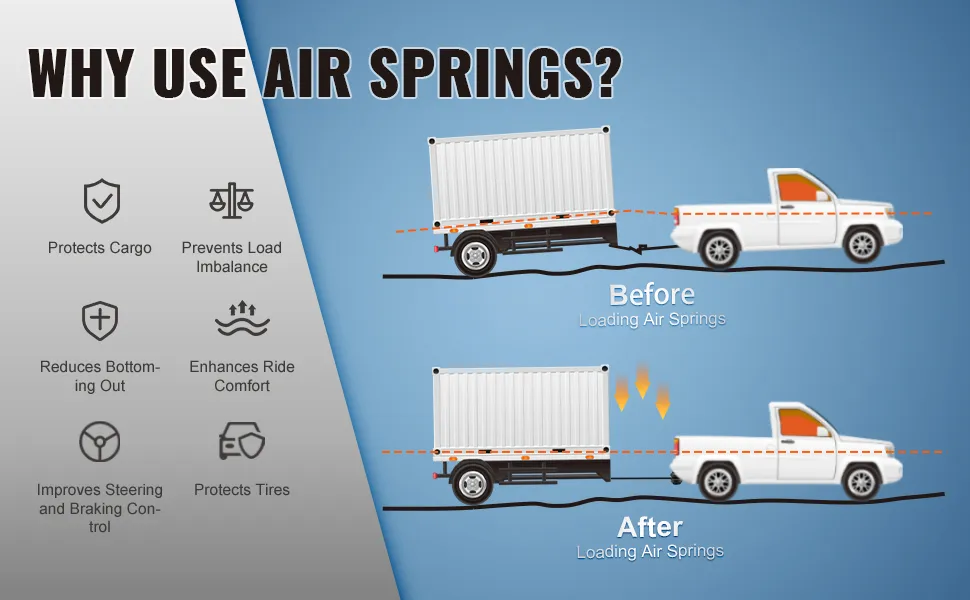 Ten zestaw jest idealny do ciężkich ładunków. Obsługuje do 5000 funtów, poprawiając osiągi pojazdu. Zmniejsza to obciążenie resorów piórowych i zapobiega dobijaniu do dna. Możesz regulować wysokość i twardość zawieszenia. Te funkcje umożliwiają regulację wysokości i poślizgu. Zapewniają płynną jazdę w różnych warunkach terenowych. Niezależnie od tego, czy holujesz, czy przewozisz ładunek, ten zestaw zapewnia stabilność samochodu. Układ zawieszenia pneumatycznego poprawia również wydajność hamowania. Dlatego jest niezawodny zarówno do jazdy w celach służbowych, jak i rekreacyjnych. Ciesz się spokojem ducha dzięki temu wytrzymałemu zestawowi zawieszenia pneumatycznego.