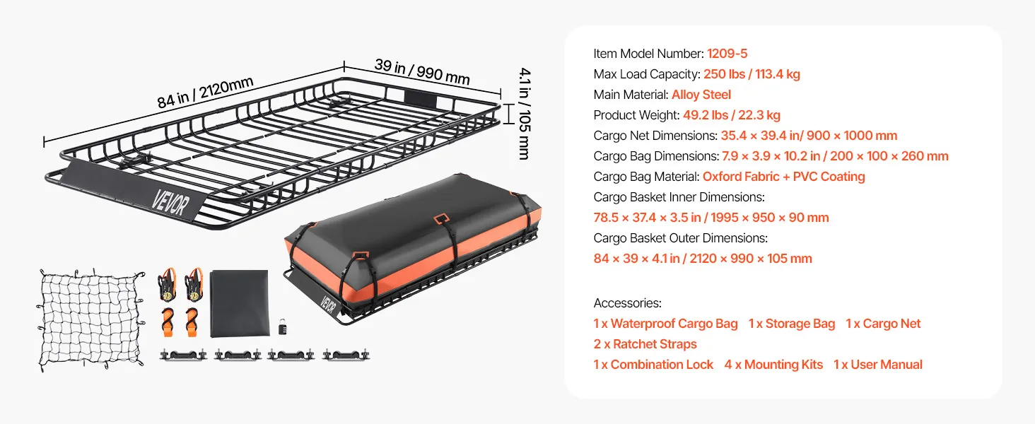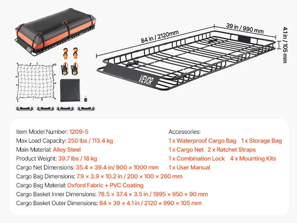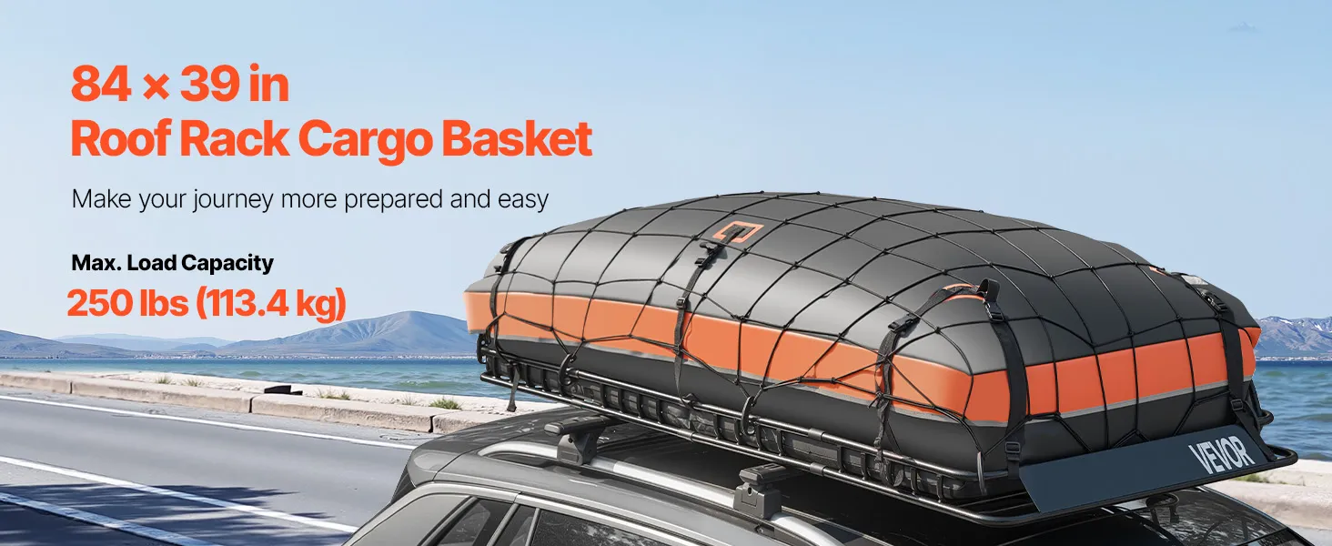 VEVOR Kosz dachowy na bagażnik dachowy do samochodu (2120 x 990 x 105 mm) Uniwersalny bagażnik dachowy z torbą bagażową, siatką i pasami zapadkowymi (maksymalne obciążenie 113,4 kg), bagażnik dachowy do samochodu SUV