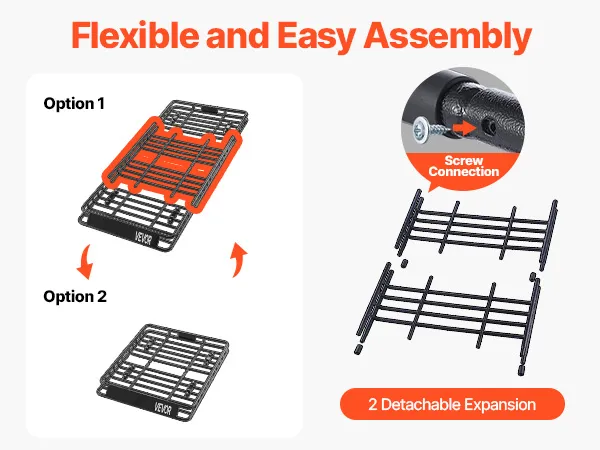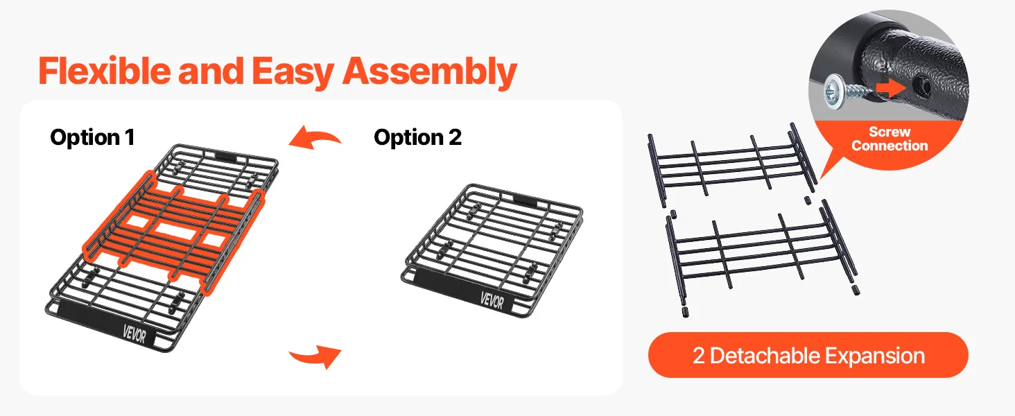 Uniwersalny bagażnik dachowy: Nasz bagażnik dachowy można łatwo zamontować na większości pojazdów i belek poprzecznych. Montaż jest szybki i łatwy dzięki czterem uniwersalnym śrubom U. Czteroczęściowa konstrukcja umożliwia elastyczną konfigurację bagażnika o różnych długościach.