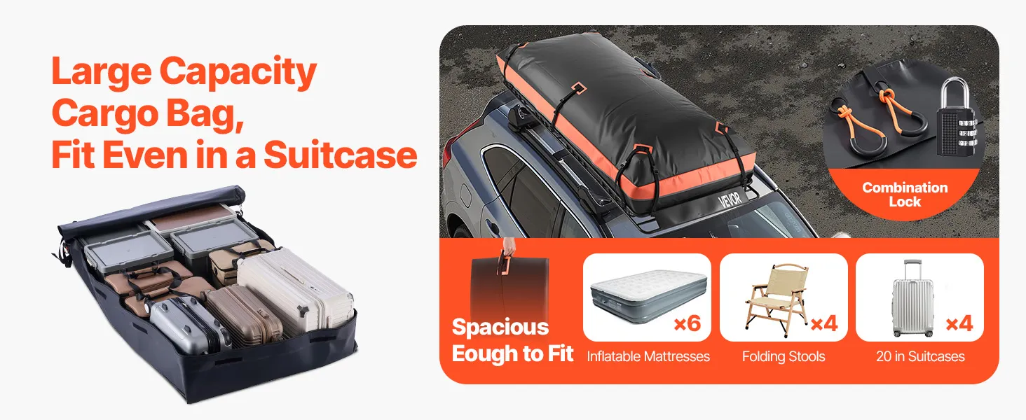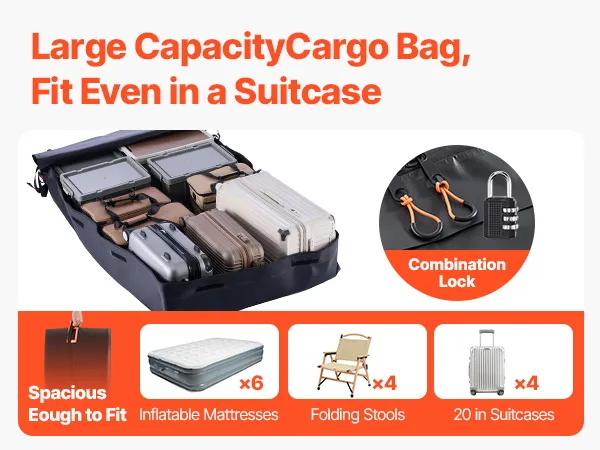 Wodoodporna torba na bagaż: Nasz bagażnik dachowy jest wyposażony w dużą, odporną na zużycie i wodoodporną torbę dachową. Chroni delikatne przedmioty przed zanieczyszczeniami drogowymi, światłem słonecznym i deszczem. Dołączony zamek szyfrowy zapewnia bezpieczeństwo Twoich cennych rzeczy.