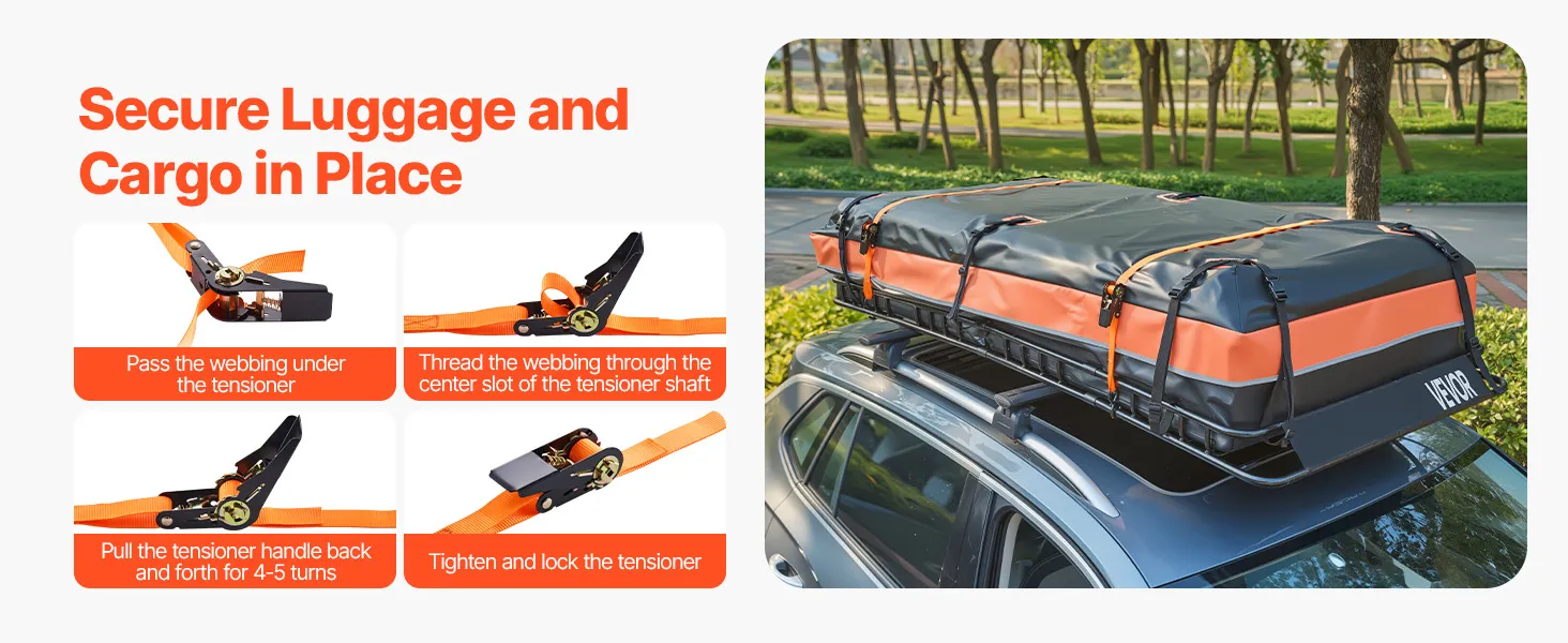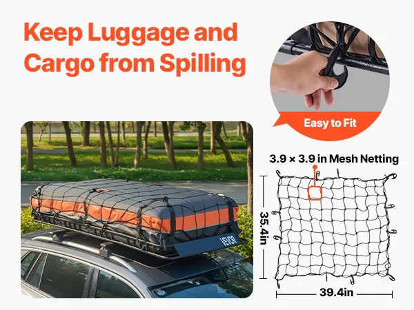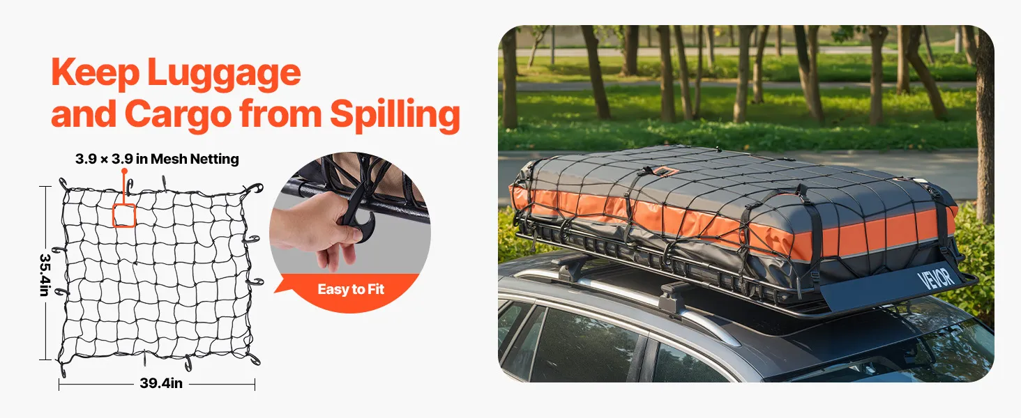 Kompletne akcesoria: Wyposażony w regulowane paski zapadkowe i siatkę do przechowywania, ten zestaw bagażnika dachowego umożliwia bezpieczne mocowanie przedmiotów o różnych kształtach i rozmiarach. Zapewnia, że pozostaną na swoim miejscu, a Twój ładunek będzie mógł być bezpiecznie transportowany.