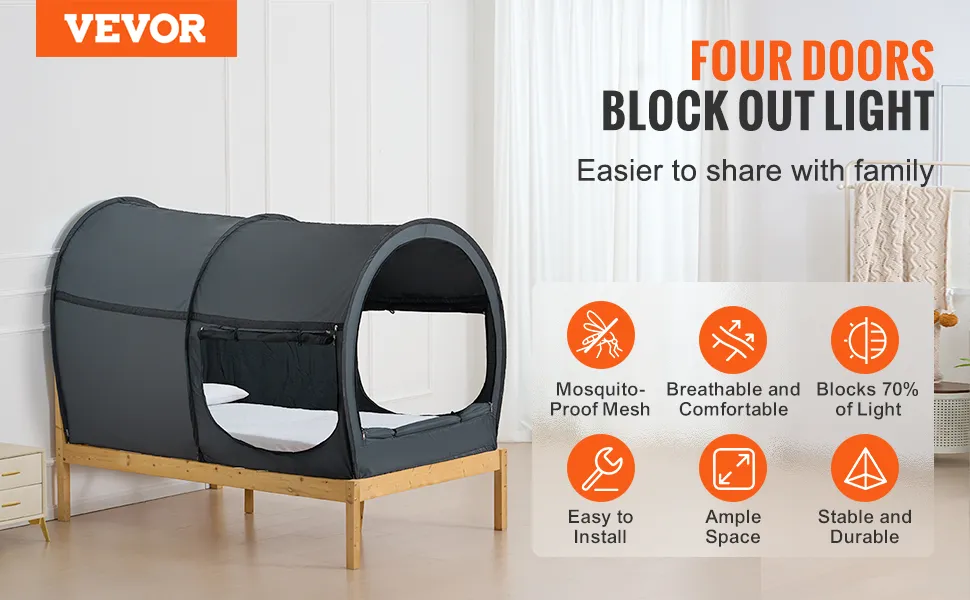 Ochrona przed światłem: Ten namiot o wymiarach 75 x 39 x 47 cali (1900 x 990 x 1190 mm) blokuje światło, tworząc przytulną, prywatną przestrzeń w akademikach, pokojach wieloosobowych lub biurach. Ciesz się bardziej relaksującą atmosferą i lepszym snem w dzień i w nocy.