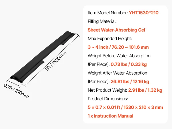 P: Jak się z tego korzysta? A: 1. Umieść suchą barierę po wewnętrznej (suchej) stronie bramy/wjazdu do garażu, aby ciśnienie wody utworzyło uszczelnienie. 2. Umieść kilka drążków obok siebie, aby zakryć całą szerokość otworu. W razie potrzeby pozostaw krawędzie na siebie. 3. Aktywuj za pomocą węża ogrodowego/deszczówki – rozszerza się do 3-4 cali (76,20-101,6 mm) w ciągu 3-5 minut.
