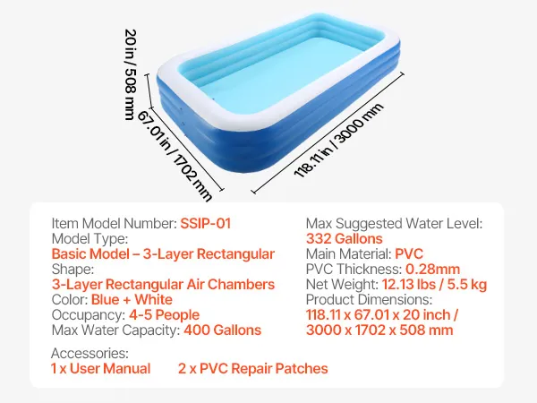 Wytrzymały i przyjazny dla skóry materiał: Ten dmuchany basen dla dzieci i dorosłych jest wykonany z wysokiej jakości tworzywa PVC i jest trwały. Spełnia międzynarodowe standardy i jest odporny na zużycie. W zestawie znajdują się dwie łatki z tworzywa PVC, które umożliwiają szybką i łatwą naprawę, zapewniając rodzinom długotrwałą zabawę.