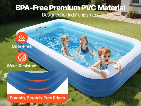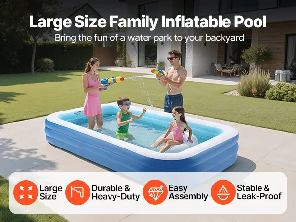Łatwy montaż: Duży basen rodzinny VEVOR jest łatwy w montażu! Wystarczy postawić go na płaskiej powierzchni i napompować pompką w 3-5 minut. Uwaga: Pompka nie jest dołączona do zestawu. Do szybkiego napompowania potrzebna będzie osobna pompka.