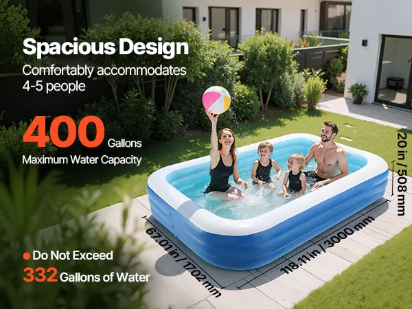 Duży dmuchany basen: Ten duży dmuchany basen rodzinny o wymiarach 3000 x 1702 x 508 mm ma pojemność 1514 litrów i pomieści 2 osoby dorosłe i 3-5 dzieci (w wieku od 3 lat). Zalecana pojemność wody to 1256 litrów. Idealny do wodnej zabawy z całą rodziną.