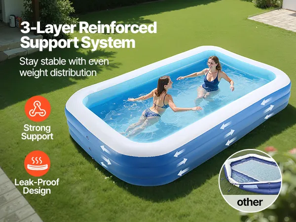 Dmuchany basen VEVOR dla dzieci i dorosłych posiada trzy niezależne komory powietrzne, które tworzą trójpierścieniową konstrukcję nośną. Zapewnia równomierne rozłożenie ciśnienia, lepszą stabilność i zapobiega chwianiu się lub przewracaniu. Ciesz się bezpiecznym i przyjemnym latem w wodzie.