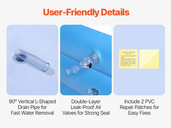 Nasz dmuchany basen wyposażony jest w pionową rurę spustową w kształcie litery L (90°), która umożliwia szybkie odprowadzanie wody, oszczędzając Twój czas. Dwuwarstwowe zawory powietrzne poprawiają szczelność i skutecznie zmniejszają ryzyko wycieku powietrza lub wody. Ciesz się szybkim, łatwym i bezpiecznym korzystaniem z wody przy każdym użyciu.