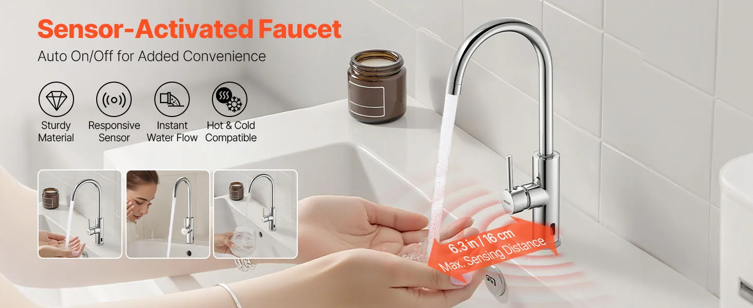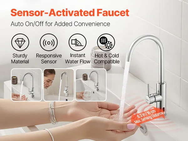 Automatyczny przepływ wody: Upiększ swoją łazienkę dzięki tej bezdotykowej baterii umywalkowej. Zintegrowany czujnik podczerwieni automatycznie uruchamia przepływ wody. Dzięki dużemu zasięgowi bateria dostarcza wodę bez wysiłku, ułatwiając mycie rąk.
