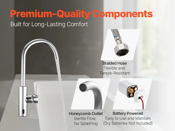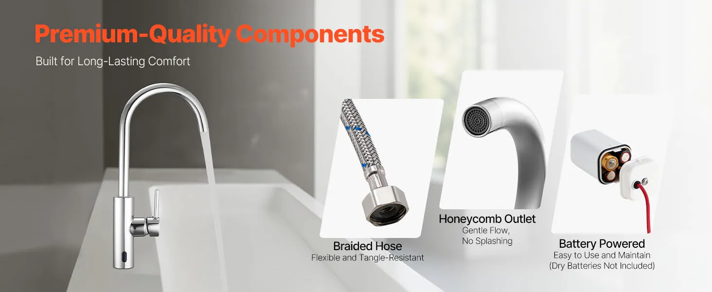 Łatwa konserwacja: Ta bezdotykowa bateria łazienkowa jest zasilana czterema bateriami alkalicznymi AA (brak w zestawie) i jest bezpieczna oraz łatwa w konserwacji. Wystarczy odkręcić górną nakrętkę – bez użycia narzędzi – aby szybko wymienić baterie.