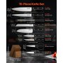 • Zestaw 15 noży: Ten 15-częściowy zestaw noży zawiera nóż szefa kuchni o długości 8 cali, nóż do krojenia o długości 8 cali, nóż do chleba o długości 8 cali, nóż Santoku o długości 7 cali, nóż uniwersalny o długości 5 cali, sześć noży do steków o długości 4,5 cala, nóż do obierania o długości 3,5 cala, ostrzałkę o długości 8 cali, nożyczki kuchenne i drewniany blok. Ten kompaktowy zestaw nadaje się do krojenia, siekania i obierania. Elegancki, nowoczesny design sprawia, że ​​jest idealnym prezentem na święta, urodziny i śluby.