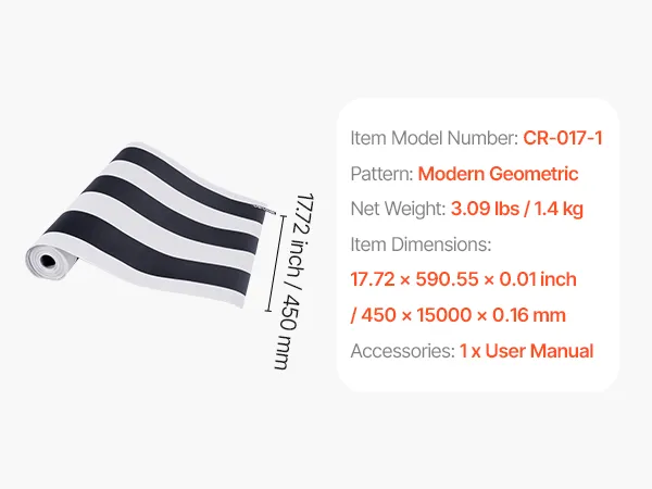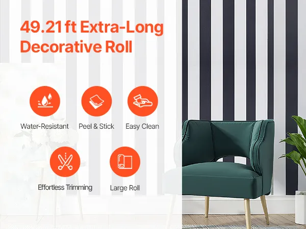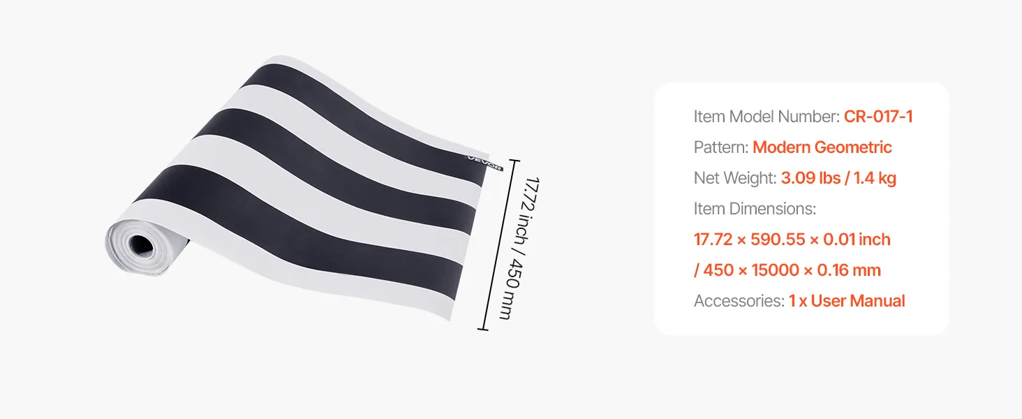 Tapeta samoprzylepna VEVOR, 45 cm x 15 m, tapeta ścienna, folia samoprzylepna w czarno-białe paski, wodoodporna, folia meblowa, dekoracyjna rolka winylowa do sypialni, kuchni, biura, łazienki Tapeta samoprzylepna VEVOR, 45 cm x 15 m, tapeta ścienna, folia samoprzylepna w czarno-białe paski, wodoodporna, folia meblowa, dekoracyjna rolka winylowa do sypialni, kuchni, biura, łazienki