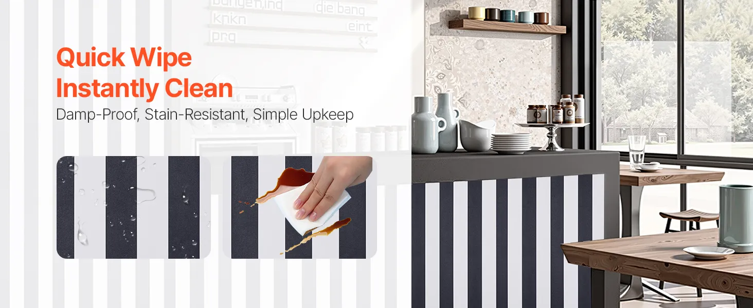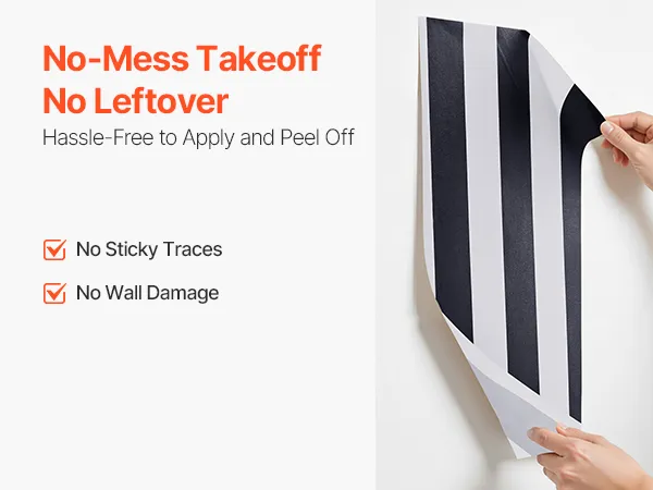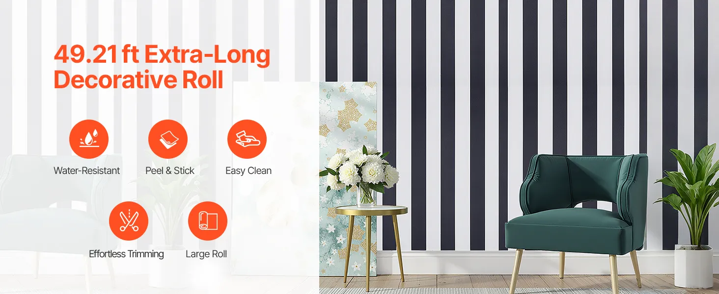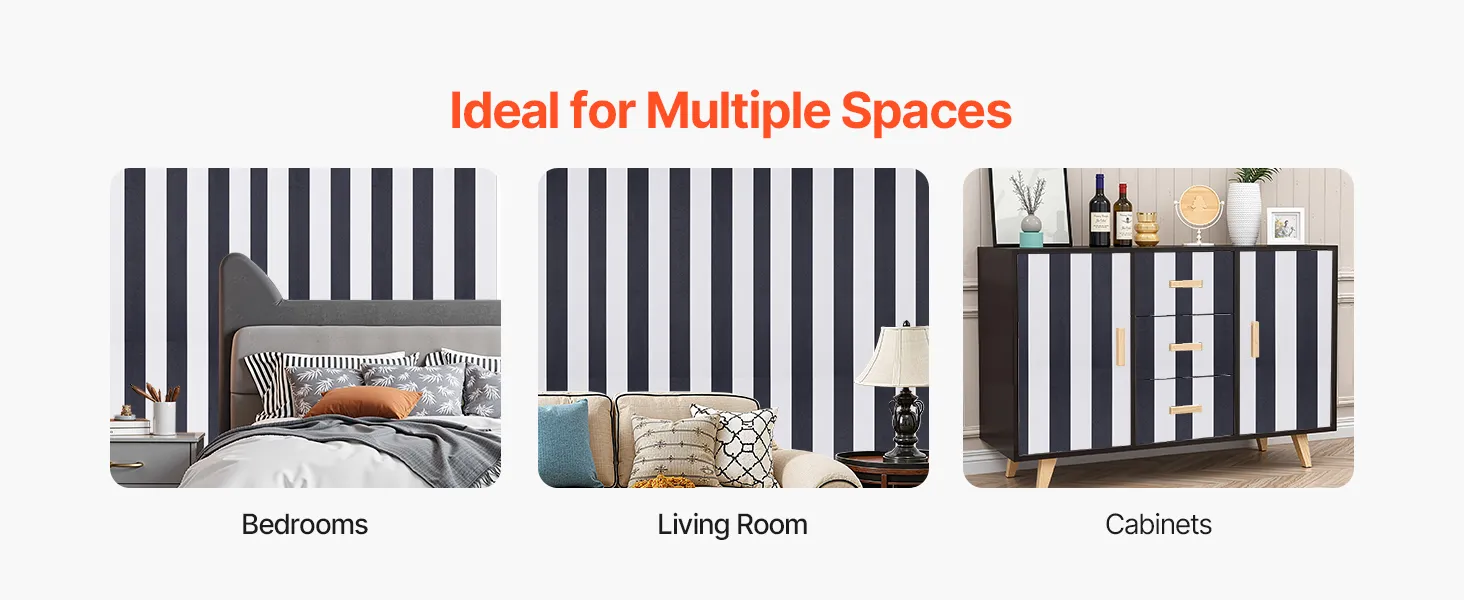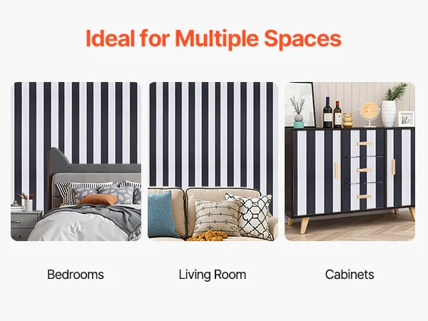 Tapeta samoprzylepna VEVOR, 45 cm x 15 m, tapeta ścienna, folia samoprzylepna w czarno-białe paski, wodoodporna, folia meblowa, dekoracyjna rolka winylowa do sypialni, kuchni, biura, łazienki