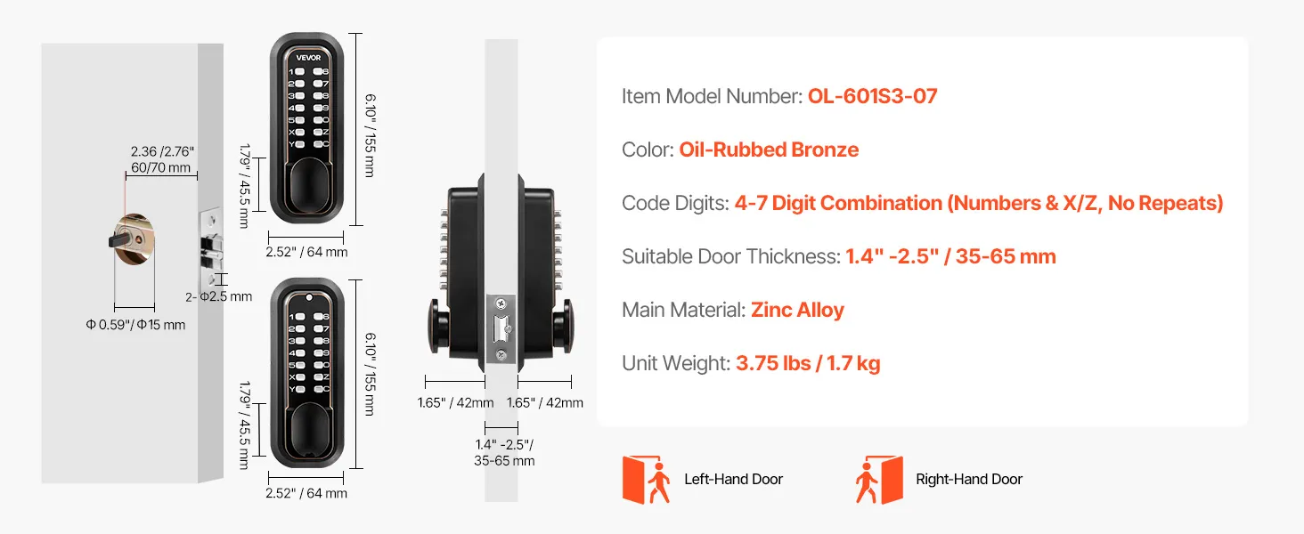 Mechaniczny zamek kodowy VEVOR z dwustronną klawiaturą (kod od 4 do 7 cyfr), bezkluczykowy zamek do drzwi z gałką i automatycznym ryglowaniem, do drzwi wejściowych i garaży, wykończenie w kolorze brązu olejowego Mechaniczny zamek kodowy VEVOR z dwustronną klawiaturą (kod od 4 do 7 cyfr), bezkluczykowy zamek do drzwi z gałką i automatycznym ryglowaniem, do drzwi wejściowych i garaży, wykończenie w kolorze brązu olejowego