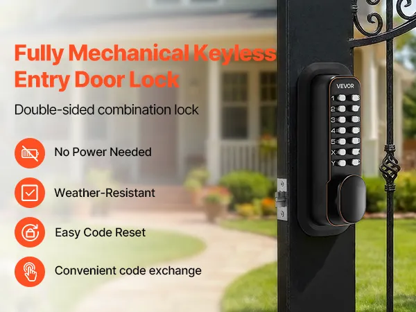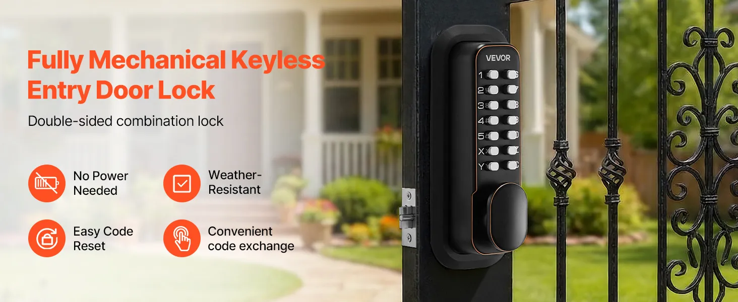 • Niezawodne bezpieczeństwo bez baterii: Ten dwustronny, mechaniczny, bezkluczykowy zamek do drzwi działa bez baterii i okablowania. Obsługuje kody od 4 do 7 cyfr, składające się z cyfr oraz liter X i Z, a kod można wprowadzać w dowolnej kolejności, co zwiększa bezpieczeństwo i uniemożliwia jego odgadnięcie.