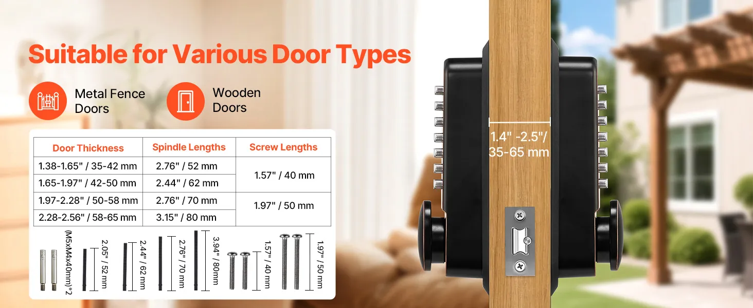 • Pasuje do wielu typów drzwi: Ten mechaniczny, bezkluczykowy zamek do drzwi jest wyposażony w cztery kwadratowe trzpienie (do drzwi o grubości 1,4–2,5 cala / 35–65 mm) i dwa rozmiary rygli (2,3 cala / 60 mm i 2,7 cala / 70 mm), co pozwala na dopasowanie do drzwi o różnej grubości. Jest kompatybilny z bramami metalowymi i drzwiami drewnianymi.