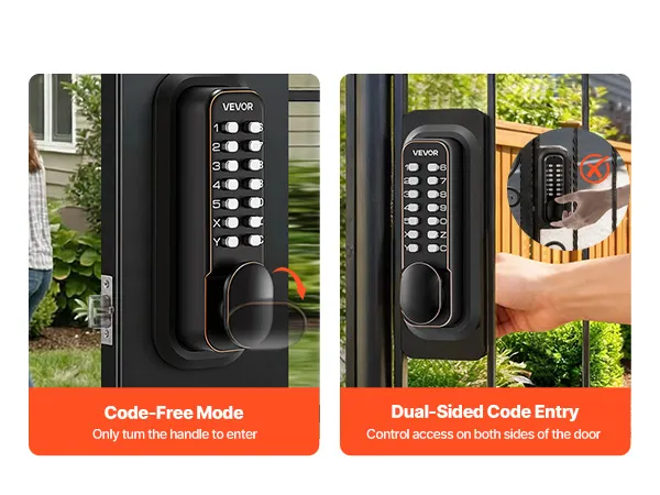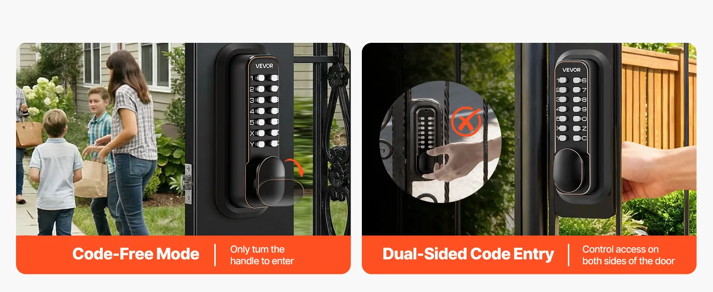 • Kontrolowany dostęp dla rodzin: Dwustronne sterowanie kodem umożliwia kontrolę dostępu z obu stron drzwi. Funkcja blokady otwarcia zamka mechanicznego zapewnia płynny dostęp bez konieczności wielokrotnego odblokowywania, co ułatwia częste wchodzenie i wychodzenie.