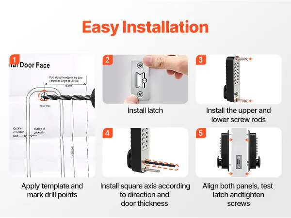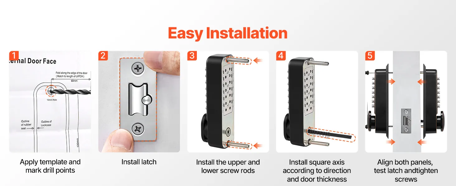 Ten mechaniczny, bezkluczykowy zamek do drzwi jest kompatybilny z bramami metalowymi, drzwiami drewnianymi i drzwiami o różnych standardowych grubościach. W zestawie znajduje się wiele wałków i śrub, które umożliwiają różne wymagania montażowe.