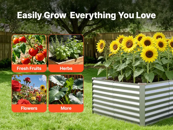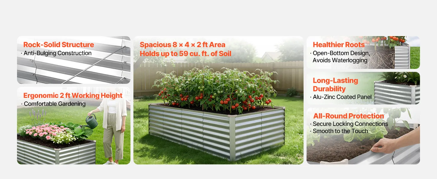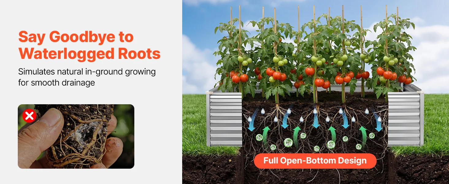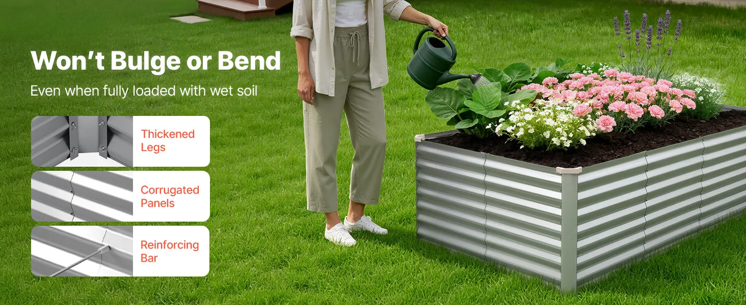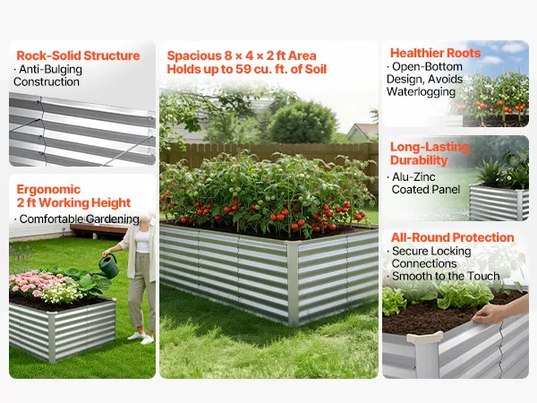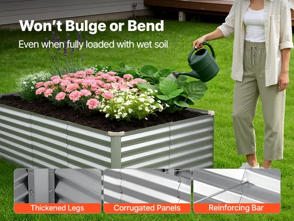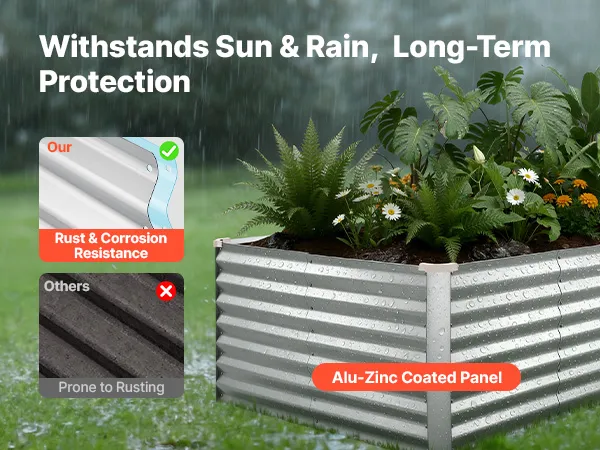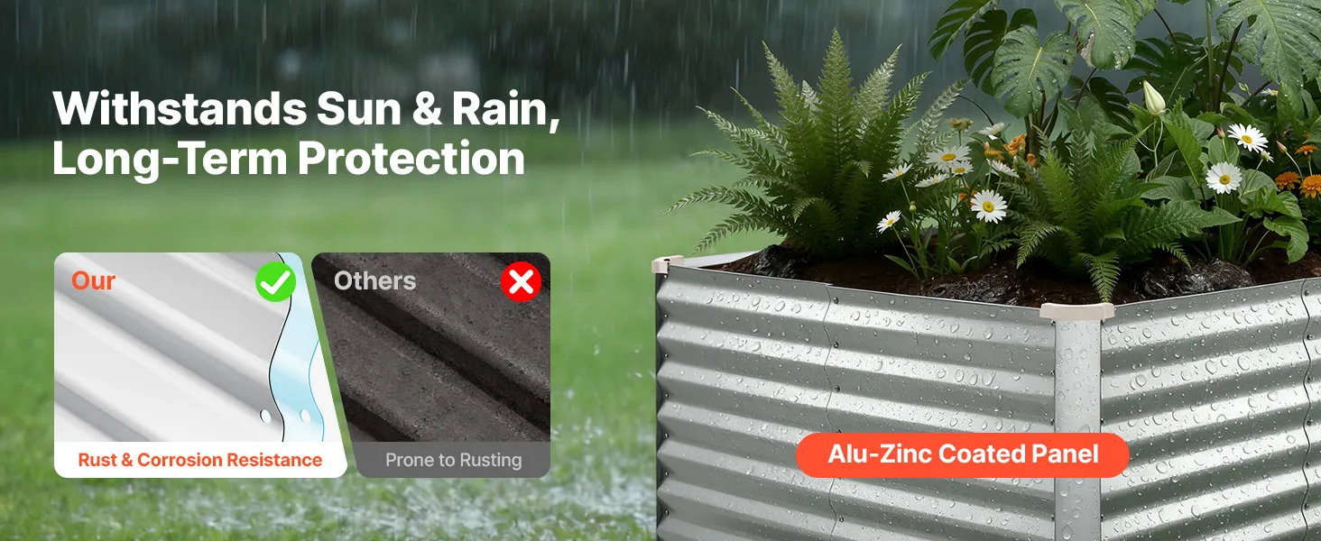 Dzięki solidnej konstrukcji z paneli aluminiowo-cynkowych i wzmocnionej konstrukcji, ta podniesiona grządka nadaje się do długotrwałego użytkowania na zewnątrz. Otwarta konstrukcja podstawy zapewnia szybki drenaż, pozwalając łatwo stworzyć ogród marzeń.