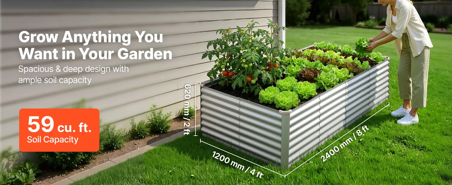 Bardzo duża powierzchnia do sadzenia: Ta podwyższona grządka o wymiarach 240 x 120 x 62 cm (8 x 4 x 2 stopy) oferuje dużo miejsca dla roślin, zapewniając odpowiednią objętość i głębokość gleby. Korzenie mają wystarczająco dużo miejsca, aby rozprzestrzeniać się zarówno w pionie, jak i w poziomie, co sprzyja zdrowemu wzrostowi warzyw i kwiatów.