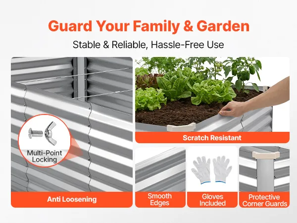 Bezpieczne ogrodnictwo: Dzięki licznym punktom mocowania i solidnej ramie, ten ogródek warzywny można stabilnie i bezpiecznie zmontować. Zaokrąglone krawędzie, ochraniacze narożników i dołączone rękawice zmniejszają ryzyko obrażeń i zapewniają bezpieczne ogrodnictwo.