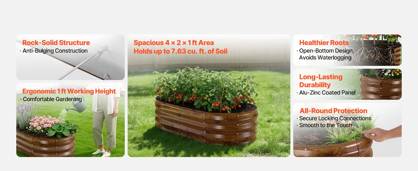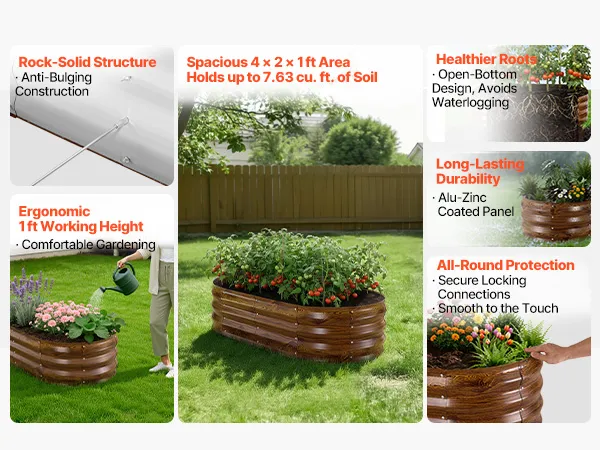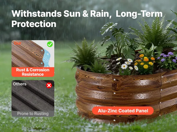 Dzięki solidnej konstrukcji z paneli aluminiowo-cynkowych i wzmocnionej konstrukcji, ta podniesiona grządka nadaje się do długotrwałego użytkowania na zewnątrz. Otwarta konstrukcja podstawy zapewnia szybki drenaż, pozwalając łatwo stworzyć ogród marzeń.
