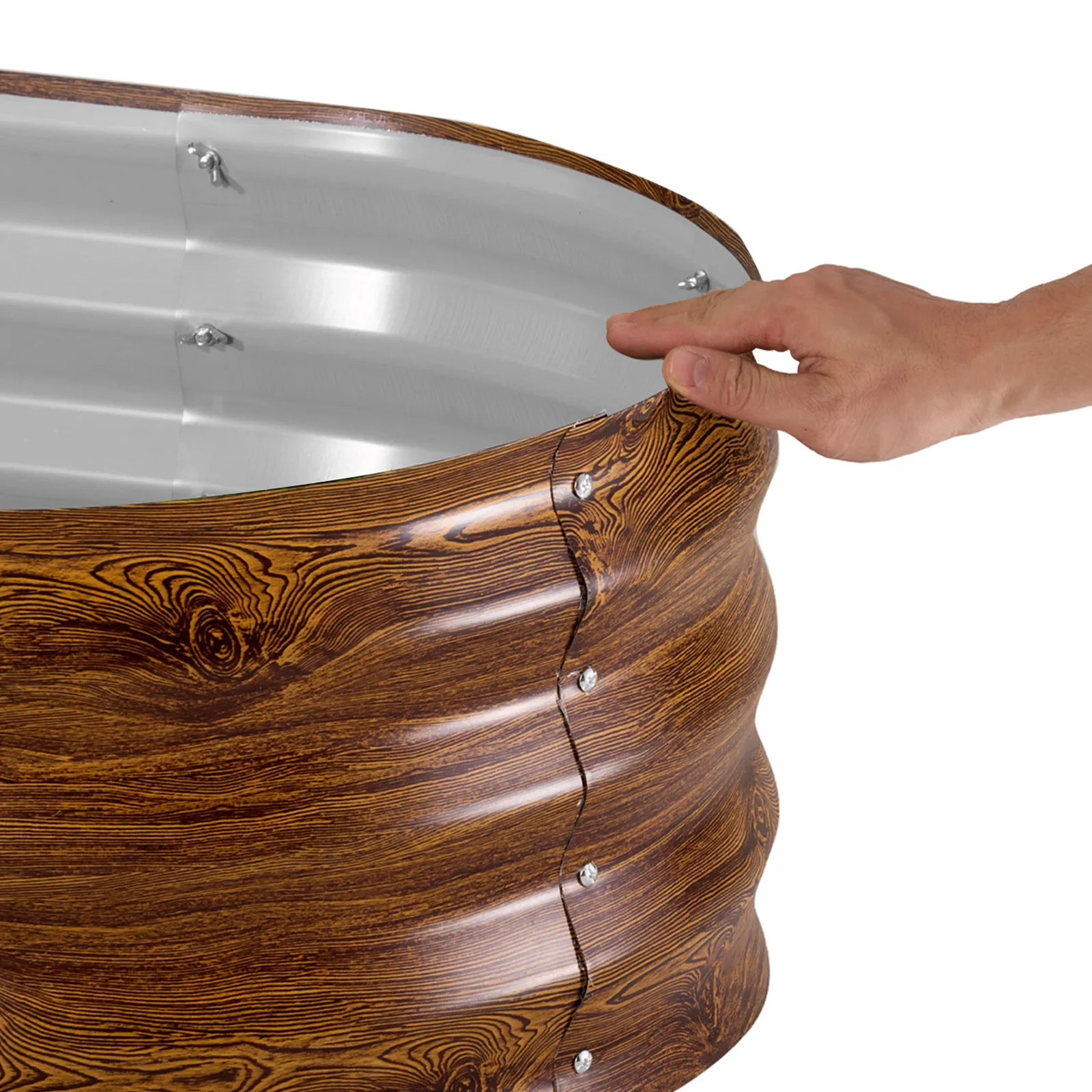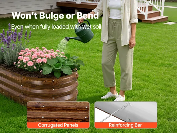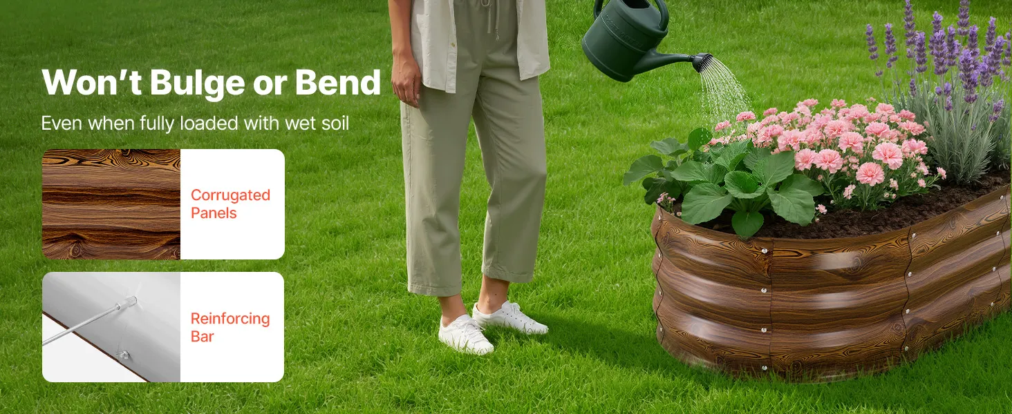 • Wzmocniona i stabilna konstrukcja: Ta donica ogrodowa jest wyposażona w faliste panele metalowe, które równomiernie rozprowadzają nacisk gleby. Pręty wzmacniające zapobiegają wybrzuszaniu się i odkształcaniu, nawet przy pełnym obciążeniu wilgotną glebą – idealne rozwiązanie do długotrwałego sadzenia.