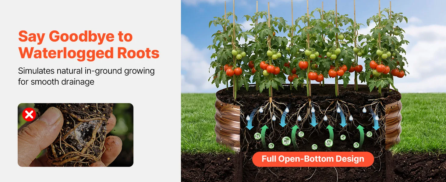 • Konstrukcja bez dna, szybki drenaż: Ta doniczka ma otwartą konstrukcję dna, która umożliwia szybki odpływ nadmiaru wody. Sprzyja to zdrowemu wzrostowi korzeni i pobieraniu składników odżywczych, a także ogranicza konieczność konserwacji, nawet podczas ulewnych deszczy lub nadmiernego podlewania.